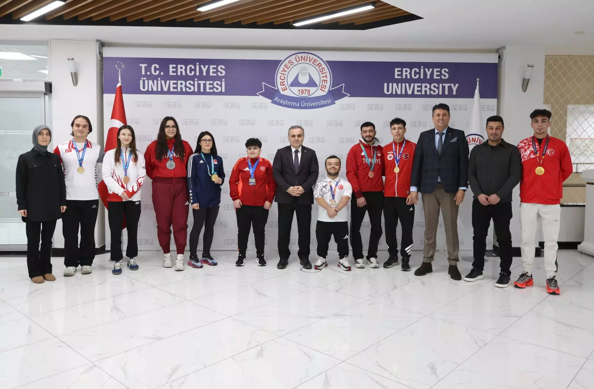 Çeşitli Avrupa şampiyonalarında derece alan Üniversitemiz Spor Bilimleri Fakültesi öğrencileri Rektörümüz Prof. Dr. Fatih Altun’u ziyaret etti.Halter Dünya Şampiyonu Çağdaş Kaya, Avrupa Şampiyonası 3000 Metre Engelli Koşusu Birincisi Kıyasettin Kaya, İşitme Engelliler Dünya İkincisi Raziye Yeşilyurt, İslami Dayanışma Oyunları May Thai Üçüncüsü Sercan Koç, İslami Dayanışma Oyunları Muay Thai Şampiyonu Gülistan Turan, Boks U23 Avrupa Şampiyonası ikincisi Hikmetgül Türkmen, Dünya Okçuluk Takım Halinde Birincilik Yunus Emre Aslan, Muay Thai Büyükler Dünya Ve Avrupa Şampiyonu Utku Mete Yağcı ve Kick Boks Avrupa üçüncüsü Olcay İrem Çelik beraberinde Spor Bilimleri Fakültesi Dekanı Prof. Dr. Prof. Dr. Mustafa Kaya ve Dekan Yardımcıları Dr. Öğr. Üyesi Murat Koç, Dr. Öğr. Üyesi Betül Coşkun ile birlikte Rektörümüz Prof. Dr. Fatih Altun’u makamında ziyaret etti.